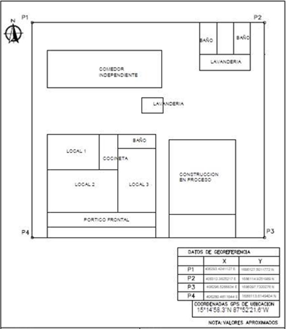 Consta de vivienda de 1 nivel con 3 habitaciones que se utilizan como locales, cocineta, 1 Baño Pórtico frontal , Galera Frontal Pórtico, Aceras, Área de Lavandería con Baños, Pórtico frontal en lavandería, Comedor independiente, Fosa Séptica, muro frontal y lateral, Pila nueva y construcción en proceso
